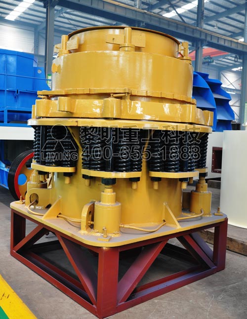 四川破碎機(jī)主要部分由機(jī)架、定錐總成、動(dòng)錐總成、彈簧機(jī)構(gòu)、碗型軸架部和傳動(dòng)裝置組成。輔助部分由電氣系統(tǒng)、稀油潤(rùn)滑系統(tǒng)、液壓清腔系統(tǒng)組成。其中定錐總成主要有調(diào)整套、軋臼壁,動(dòng)錐總成主要由主軸、動(dòng)錐體、破碎壁組成,傳動(dòng)部分主要由大帶輪、傳動(dòng)軸、小錐齒輪、大錐齒輪等組成。