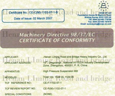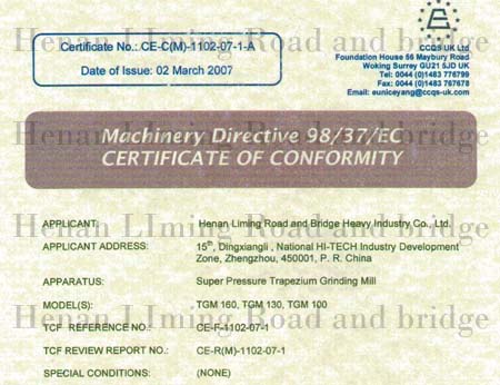 熱烈祝賀我公司超壓梯形磨粉機、高壓懸輥磨粉機全套生產(chǎn)線系列產(chǎn)品通過歐盟CE認證。我公司也是目前國內一家通過同類設備CE認證的企業(yè)。