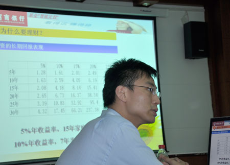 整個培訓(xùn)以探討交流的模式進行,主講人從理財角度介紹證券的幾大分類以及投資方式,并結(jié)合自身,對特定的投資模式進行了分析。接下來的環(huán)節(jié),主要采取提問回答的方式,根據(jù)要求,主講人回顧了前幾年的金融形勢,以前經(jīng)濟模式,簡單展望了現(xiàn)在的經(jīng)濟發(fā)展。隨后從安全性、風(fēng)險性等方面講解了基金、國債、分紅保險、存款的不同特點。整個培訓(xùn)現(xiàn)場異?;鸨?,大家積極發(fā)言,主講人熱情解答,贏得陣陣掌聲。