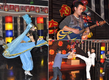 晚會在現(xiàn)代團體舞《快樂寶貝》激情歡快的節(jié)奏中拉開序幕。在隨后上演的眾多節(jié)目中,歌曲串燒、表演秀、神奇魔術(shù)、詼諧小品、武術(shù)表演等幽默勁爆節(jié)目給廣大員工帶來強烈的感官沖擊,現(xiàn)場觀眾情緒高漲、熱鬧歡騰;接下來,婉轉(zhuǎn)悠揚的笛子演奏、夢幻的藏族、新疆舞蹈,以及優(yōu)雅歡快的爵士舞蹈又把晚會現(xiàn)場帶入另一個高雅唯美的情感世界。整場晚會,在全體參與人員的共同努力下,通過不同節(jié)奏的變換、不同主題的穿插,為全體同事呈現(xiàn)了一場豐富、豐厚、豐滿的文化藝術(shù)大餐。