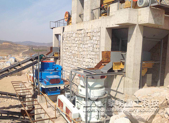 大塊物料經(jīng)過GZD1500×6000振動給料機(jī)被均勻的送進(jìn)HJW145高能顎破中進(jìn)行粗碎;粗碎后的物料經(jīng)過兩臺GZD960×3800振動給料機(jī)進(jìn)入兩臺HJ98高能顎破中進(jìn)行中碎;中碎后的物料經(jīng)過兩臺GZD960×3800振動給料機(jī)均勻的喂入兩臺HPT300多缸液壓圓錐破進(jìn)行細(xì)碎;細(xì)碎后的物料經(jīng)過三臺YZS2160振動篩分級后,10-25mm成為骨料產(chǎn)品,25mm以上的返回HPT300多缸液壓圓錐破循環(huán)破碎,0-10mm的物料進(jìn)入VSI9526沖擊破進(jìn)行整形,產(chǎn)出0-5mm的成品機(jī)制砂。