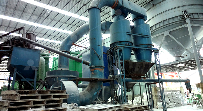 第二階段:磨粉破碎后的方解石小塊物料經(jīng)提升機(jī)送至料倉,再經(jīng)振動給料機(jī)將其均勻定量的送入磨機(jī)研磨室內(nèi)進(jìn)行研磨。