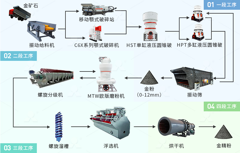 金礦石加工生產(chǎn)工藝主要包括:破碎、磨礦、選礦三個(gè)過(guò)程: