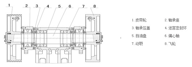 檢查飛、槽輪配重中心位置是否正確,槽輪配重中心應通過主軸中心孔與主軸偏心孔相對應180度成為一條直線。