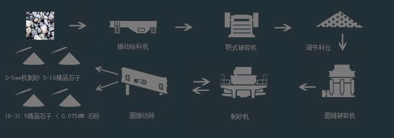 大塊石料經(jīng)料倉由振動給料機均勻地送進顎式破碎機中粗碎,產(chǎn)出的粗料由皮帶輸送機輸送至液壓圓錐式破碎機細碎,細碎后的石料進入制砂機整形,由振動篩篩分出不同規(guī)格的砂石料。