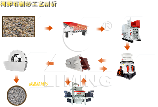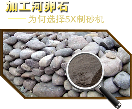 目前河卵石制砂合理的配置是粗碎用顎破,中碎用圓錐破(小產(chǎn)量可用細(xì)顎破),制砂用離心沖擊式破碎機(jī)(5X制砂機(jī))的三級破碎。
