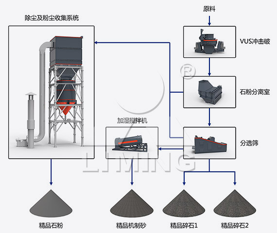原料通過(guò)斗提機(jī)被送入頂樓,由原料輸送皮帶將0~40mm的碎石送入VUS沖擊破,經(jīng)過(guò)高頻石打石研磨后進(jìn)入石粉分離室,通過(guò)調(diào)整控粉箱進(jìn)風(fēng)口大小和系統(tǒng)風(fēng)量來(lái)調(diào)節(jié)制砂含粉量;處理后的物料進(jìn)入分選篩內(nèi)分選出精品碎石、石粉及準(zhǔn)成品砂。其中石粉通過(guò)除塵及粉塵收集系統(tǒng)處理后收集為精品石粉,準(zhǔn)成品砂通過(guò)加濕攪拌機(jī)均勻拌合后即為精品機(jī)制砂。 經(jīng)VUS砂石同出系統(tǒng)處理后,能夠產(chǎn)出級(jí)配合理、粒型圓潤(rùn)、含粉量可控的精品粗細(xì)骨料(碎石、機(jī)制砂),以及干燥潔凈、可進(jìn)行統(tǒng)一回收利用的高附加值石粉(根據(jù)原料決定可應(yīng)用范圍)。