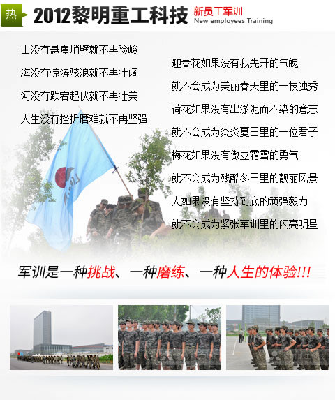 黎明重工科技自2004年啟動大學(xué)生員工計劃以來,軍訓(xùn)拓訓(xùn)已成為每一位新員工入職的必經(jīng)之路。百余位職場新人朝夕相對,統(tǒng)一的作息時間,近似嚴(yán)苛的軍訓(xùn)項目,蘊藏深意的拓訓(xùn)內(nèi)容。流火的七月,肆意揮灑的汗水,熱情洋溢的青春,2012屆新進(jìn)職員,即將在這里開啟人生新的篇章。
