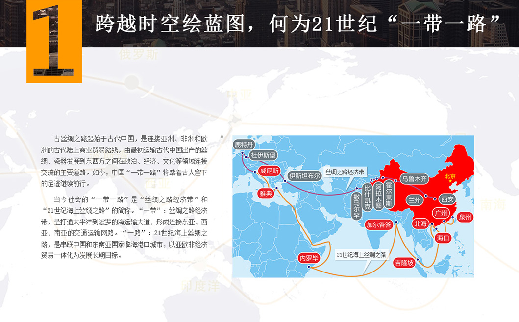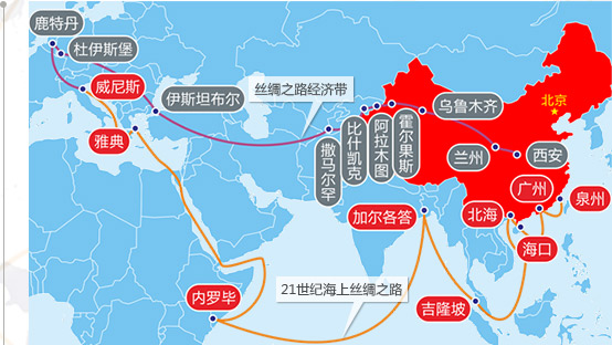 當(dāng)今社會(huì)的“一帶一路倡議”是“絲綢之路經(jīng)濟(jì)帶”和 “21世紀(jì)海上絲綢之路”的簡(jiǎn)稱(chēng)。“一帶”:絲綢之路經(jīng)濟(jì)帶,是打通太平洋到波羅的海運(yùn)輸大道,形成連接?xùn)|亞、 西亞、南亞的交通運(yùn)輸網(wǎng)路。“一路”:21世紀(jì)海上絲綢之路,是串聯(lián)中國(guó)和東南亞國(guó)家臨海港口城市,以亞歐非經(jīng) 濟(jì)貿(mào)易一體化為發(fā)展長(zhǎng)期目標(biāo)。