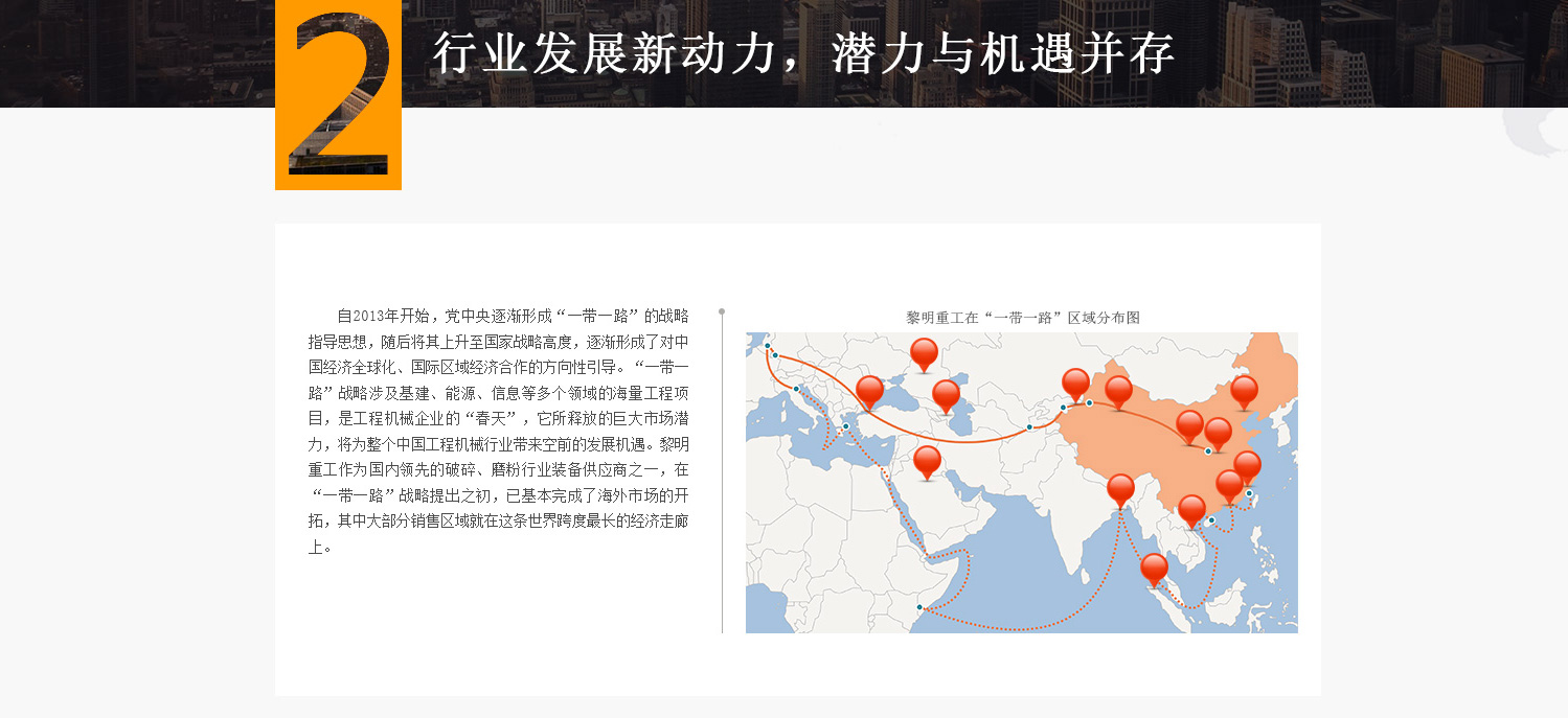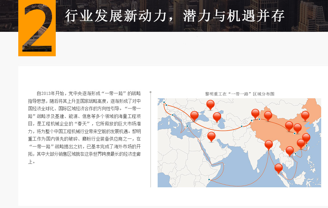 自2013年開(kāi)始,黨中央逐漸形成“一帶一路倡議”的戰(zhàn)略指導(dǎo)思想,隨后將其上升至國(guó)家戰(zhàn)略高度,逐漸形成了對(duì)中國(guó)經(jīng)濟(jì)全球化、國(guó)際區(qū)域經(jīng)濟(jì)合作的方向性引導(dǎo)。“一帶一路倡議”戰(zhàn)略涉及基建、能源、信息等多個(gè)領(lǐng)域的海量工程項(xiàng)目,是工程機(jī)械企業(yè)的“春天”,它所釋放的巨大市場(chǎng)潛力,將為整個(gè)中國(guó)工程機(jī)械行業(yè)帶來(lái)發(fā)展機(jī)遇。黎明重工作為國(guó)內(nèi)知名的破碎、磨粉行業(yè)裝備供應(yīng)商之一,在“一帶一路倡議”戰(zhàn)略提出之初,已基本完成了海外市場(chǎng)的開(kāi)拓,其中大部分銷(xiāo)售區(qū)域就在這條世界跨度最長(zhǎng)的經(jīng)濟(jì)走廊上。