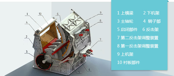 由機(jī)架部分、轉(zhuǎn)子部分、反擊架、翻蓋裝置和傳動(dòng)部分組成。工作時(shí),電機(jī)高速旋轉(zhuǎn)帶動(dòng)轉(zhuǎn)子做高速運(yùn)動(dòng)。當(dāng)物料由入料口進(jìn)入機(jī)器時(shí),受到轉(zhuǎn)子上的板錘高速撞擊而被破碎,然后被拋到反擊襯板上再次破碎,之后又從反擊襯板上彈回到板錘作用區(qū)重新破碎。在此過程中,物料之間也相互撞擊,達(dá)到破碎的效果。此過程重復(fù)進(jìn)行,直到物料被破碎至所需粒度,由出料口排出。